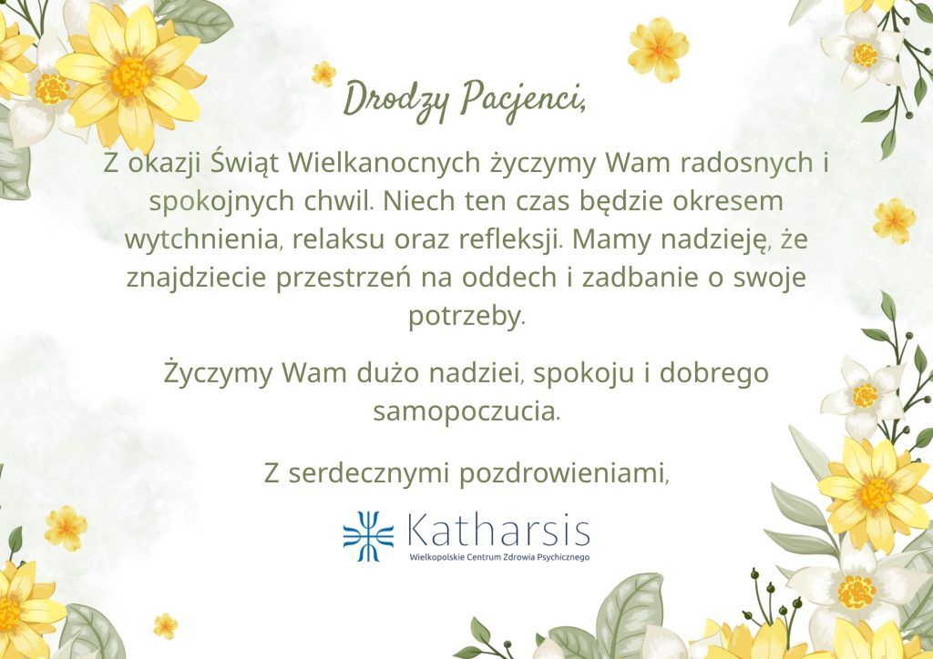 Życzenia Wielkanocne Admin 02/04/2026 Aktualności W imieniu całego Zespołu Katharsis składamy najserdeczniejsze życzenia Nawigacja wpisu Poprzedni Poprzedni wpis: Bieg „Równi i Razem w Biegu”.Następny Następny wpis: Dołącz do zespołu Katharsis